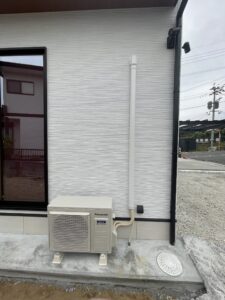 ■ 施工内容:標準取り付け工事+屋外配管カバー仕上げ見た目の美しさと耐久性を重視されるお客様のご要望で、屋外の配管を化粧カバーで仕上げました。